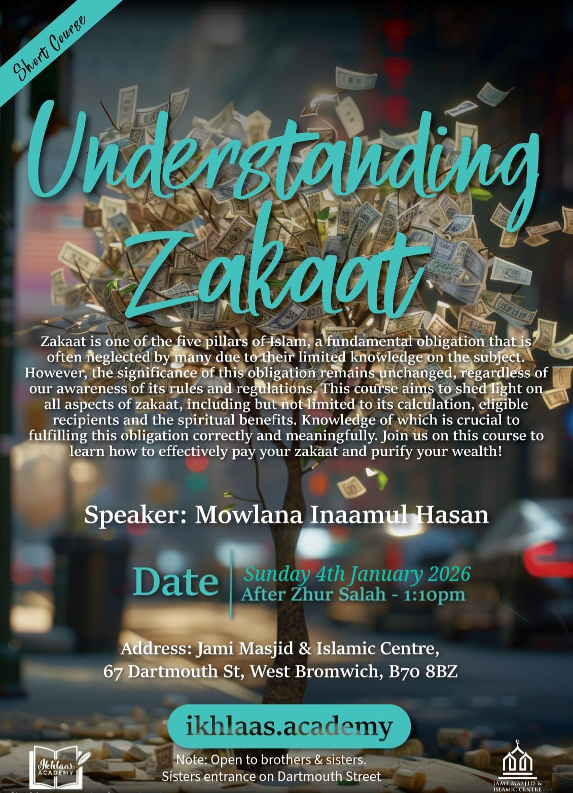 Zakaat is a vital pillar of Islam that many overlook due to their lack of understanding of the subject. This one-day course will provide essential knowledge on calculating Zakaat, identifying eligible recipients, and exploring its spiritual benefits, ensuring that you fulfill this important obligation correctly. After popular demand, we'd like to invite you to join us on the 23rd February, after Zhur Salah at 1:10 pm, to deepen your understanding and learn how to effectively pay your Zakaat and purify your wealth!